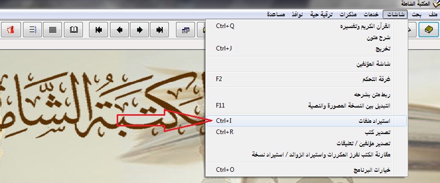 3. امکان اضافه کردن تحقیقات شخصی و فایلهای وُرد به ان و جستجو در آنها؛ روش: --» منوی شاشات--» استیراد ملفات--» ادرس فایل مورد نظر در کادر بالای سمت چپ/کشیدن فایل مورد نظر از کادر بالا سمت راست به کادر پائین/کلیک بر روی استیراد الکتب